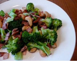 Remove bacon from pan and place into serving bowl along with broccoli and cashews. Combine well.